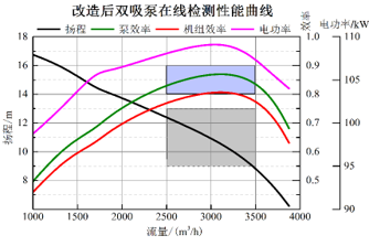 在常用流量2500m3/h到3500m3/h范围内,改造后单泵效率均在83%以上。